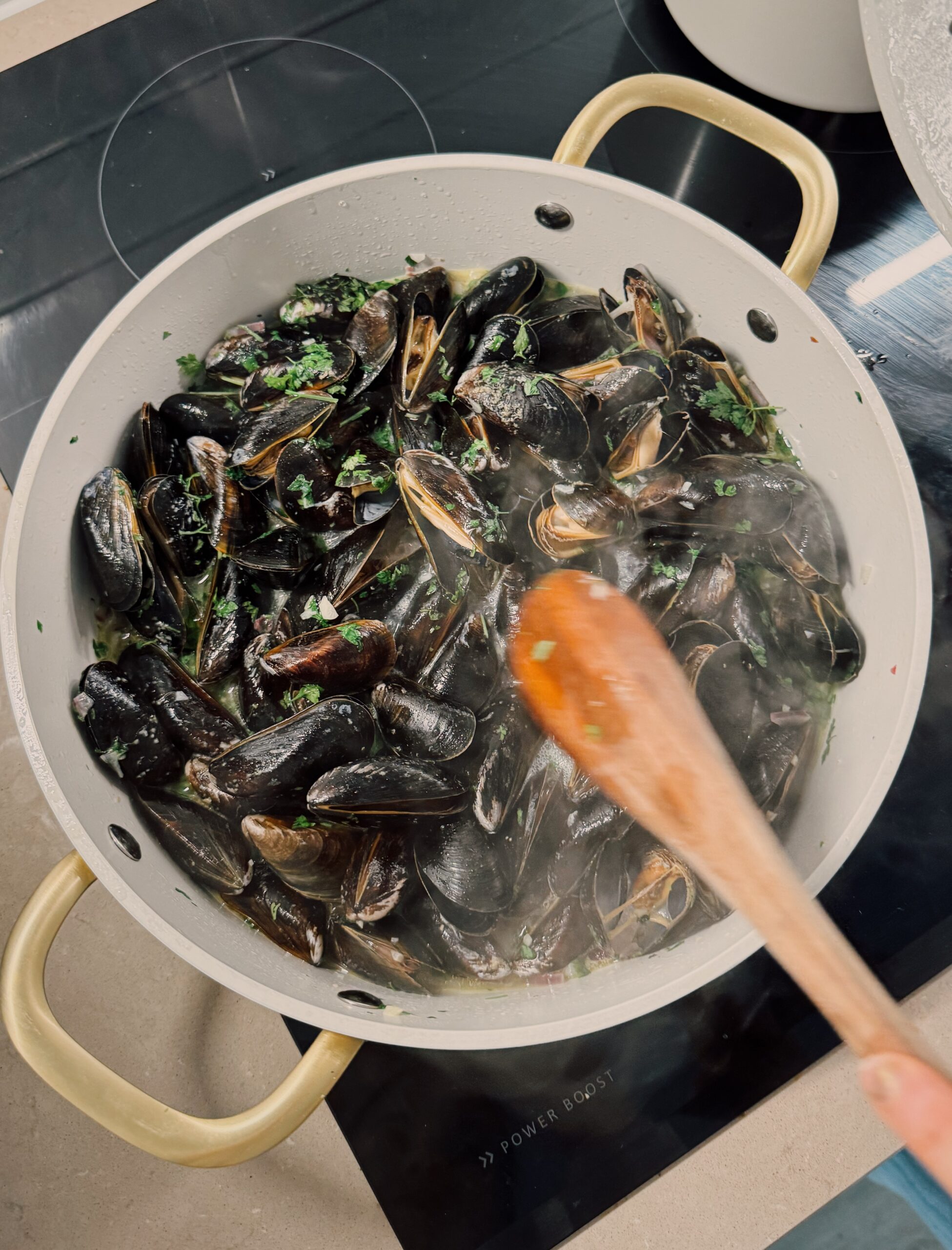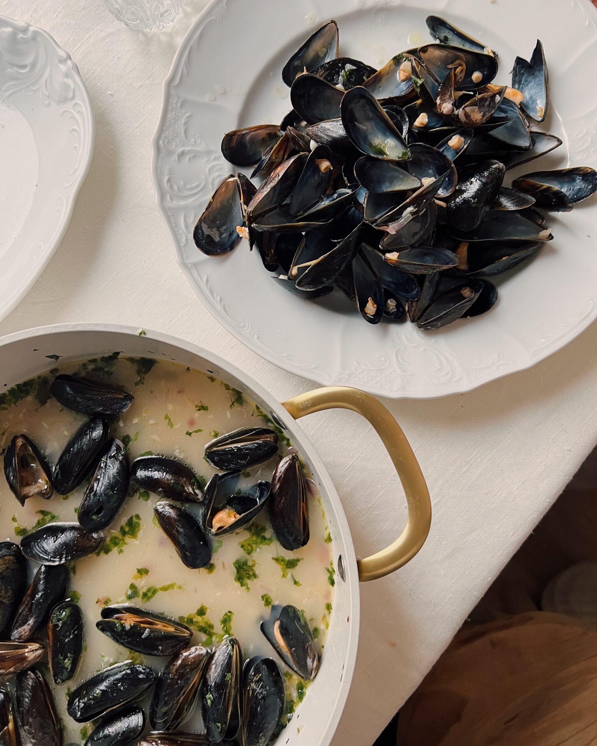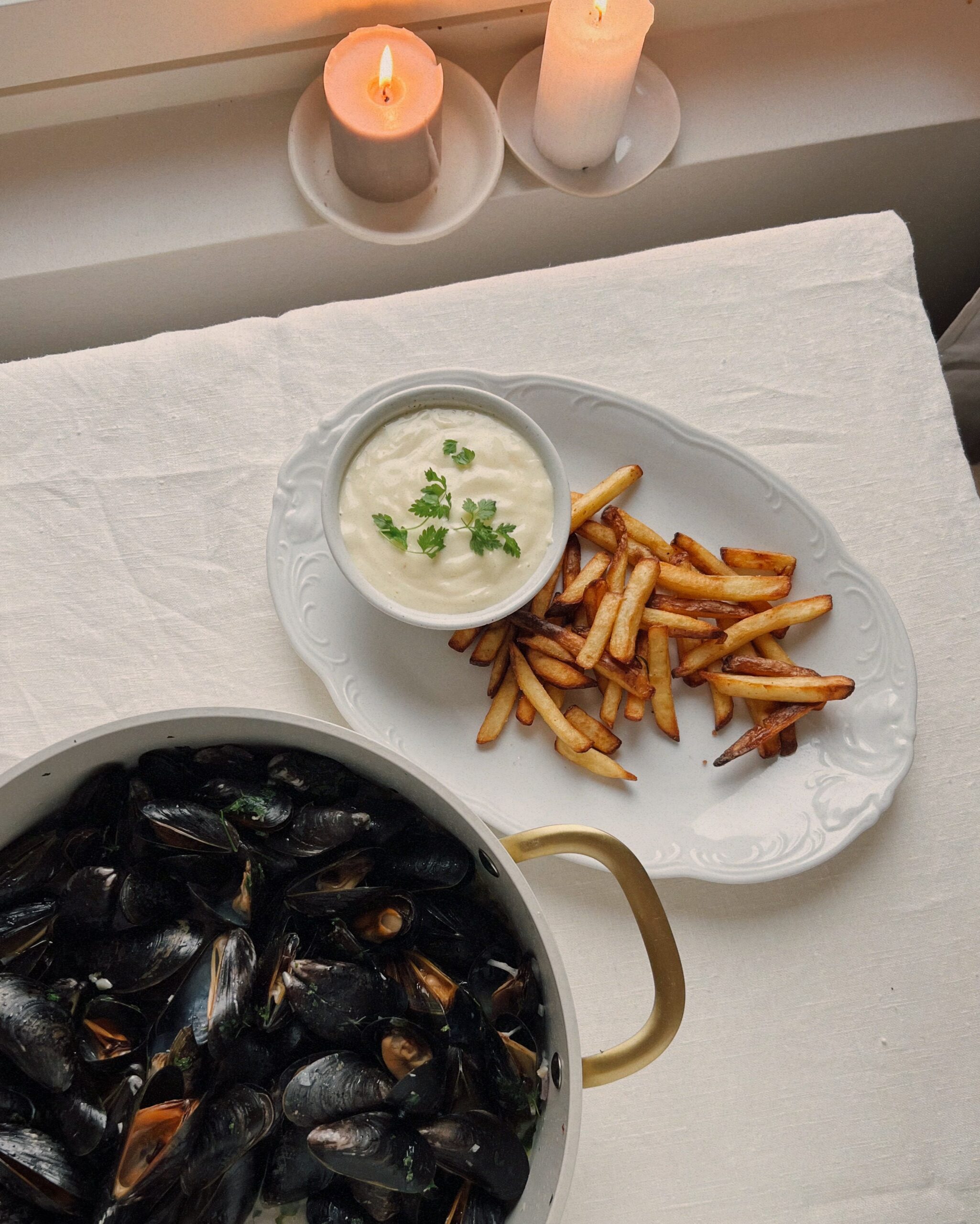 Sinisimpukat valkoviinissä, ranskalaiset ja itse tehty aioli