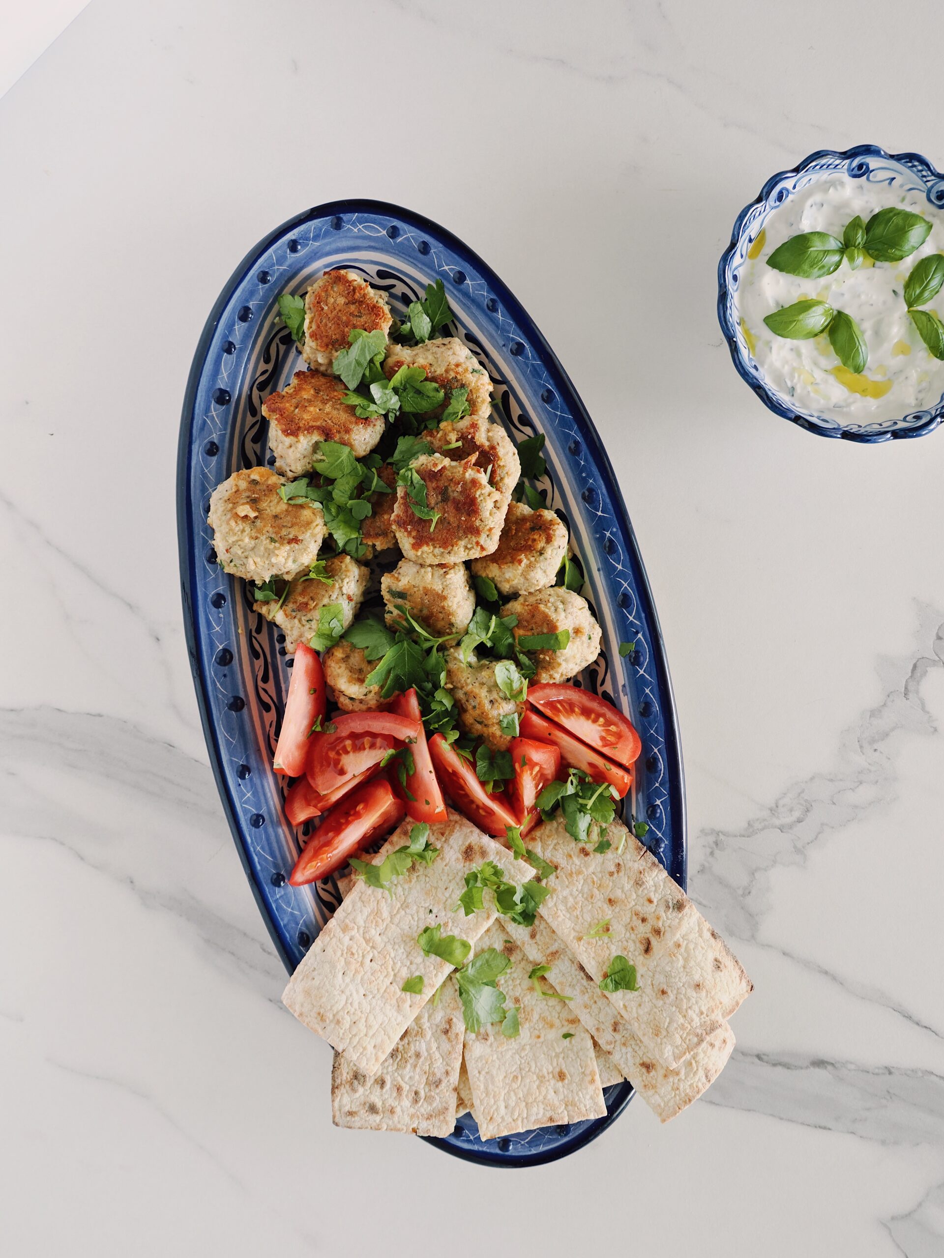 Yhdistä kanan jauheliha, kananmuna, murusteltu fetajuusto, valkosipuli, persilja ja mausteet kulhossa. Sekoita tasaiseksi massaksi. Anna halutessasi vetäytyä jääkaapissa noin 15 minuuttia, jotta taikina kiinteytyy. Kostuta kädet kevyesti vedellä ja pyörittele taikinasta noin 12 pyörykkää.