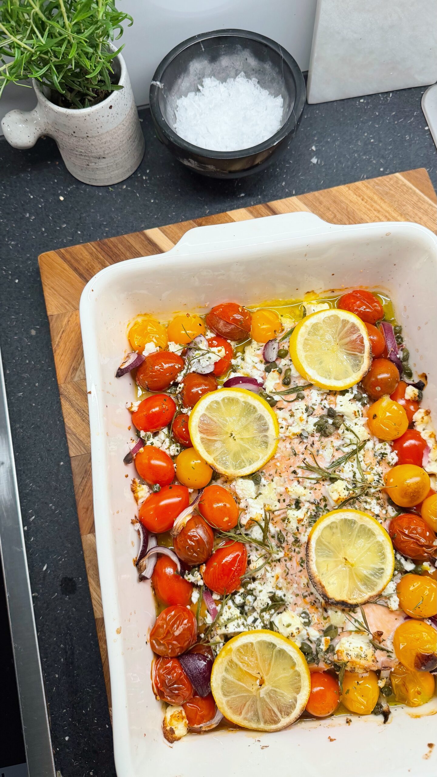 Tämä välimeren uunilohi on helppo ja maukas arkiruoka, joka valmistuu yhdellä uunivuoalla. Mehukas lohifilee, uunissa pehmenneet tomaatit, fetajuusto ja aromaattiset yrtit tekevät tästä lohireseptistä raikkaan ja ravitsevan vaihtoehdon kiireiseen arkeen. Resepti sopii täydellisesti nopeaksi uunilohireseptiksi ja on helppo yhdistää esimerkiksi couscousin, pastan tai tuoreen leivän kanssa.