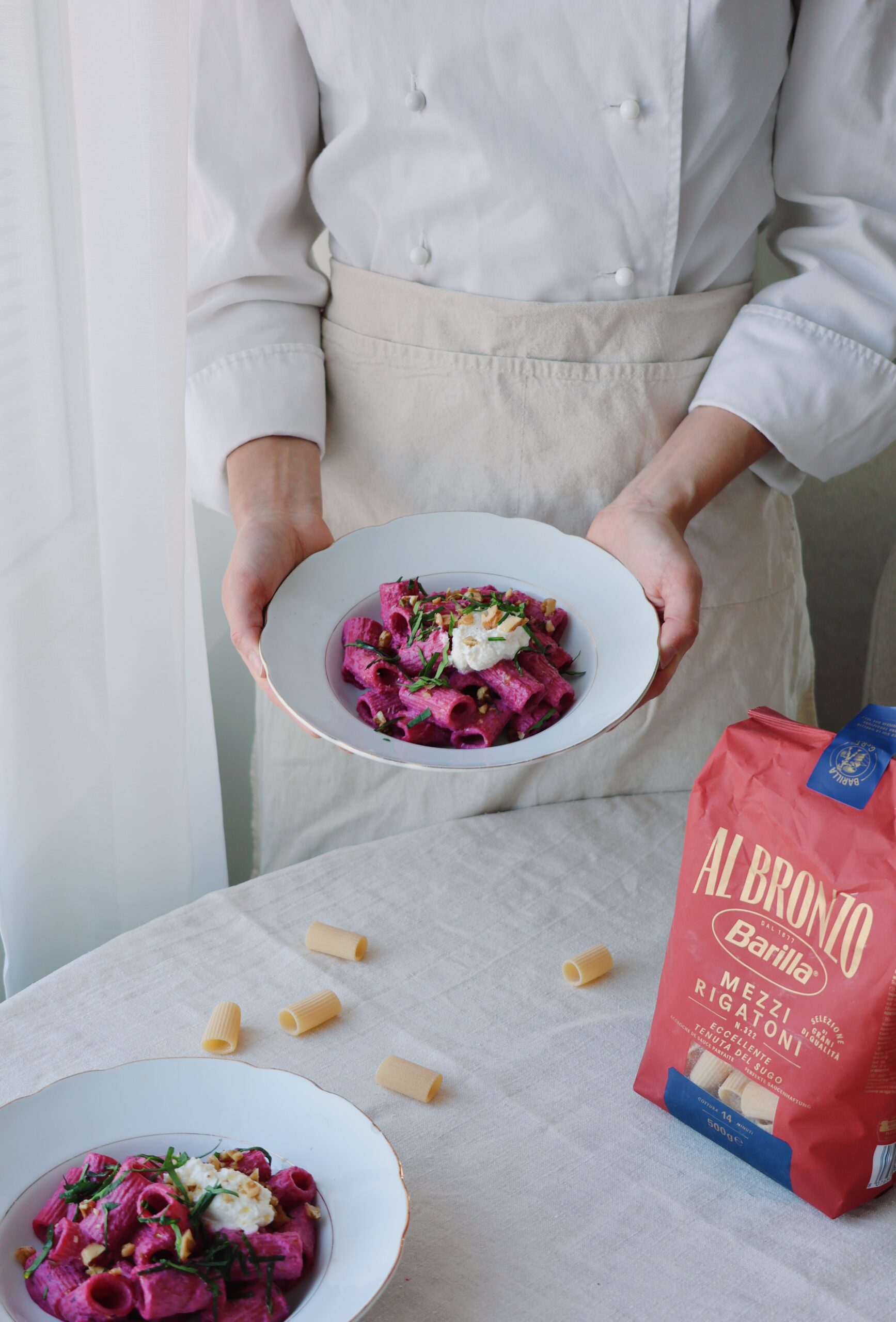 Pehmeän kermaisa, hieman makea ja sitruunalla raikastettu ricotta–punajuurikastike kietoutuu täydellisesti laadukkaan pastan ympärille. Lopputulos on sekä lohdullinen että elegantti. Tämän annoksen sydän on Barilla Al Bronzo Mezzi Rigatoni, joka on valmistettu pronssimuotilla. Pronssimuotin ansiosta pastan pinta on ihanan karhea, mikä tarkoittaa yhtä asiaa: kastike tarttuu siihen täydellisesti. Juuri tämä tekee Al Bronzo -pastasta erityisen, ja jokainen suupala on täynnä makua.