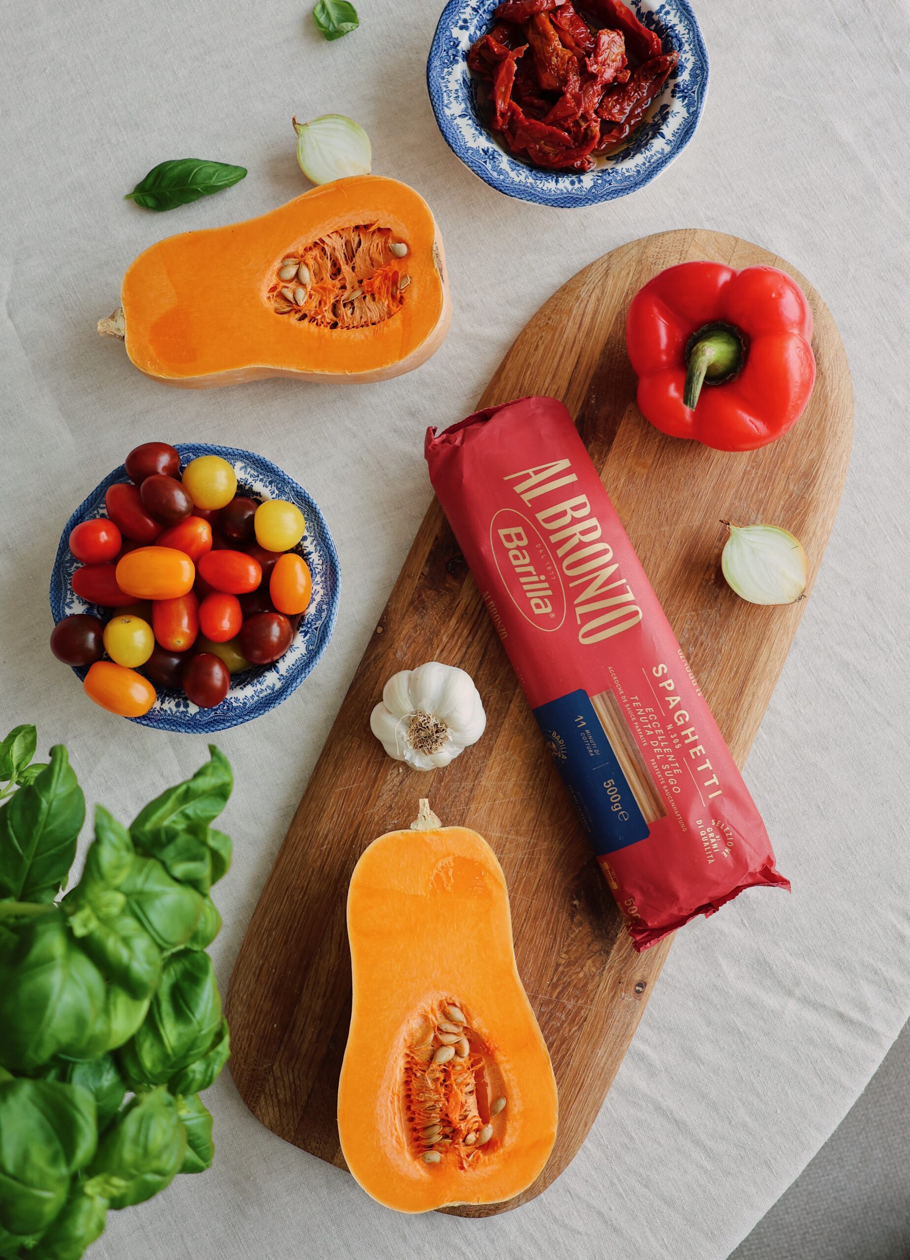 Paahdettu kasvispasta burratalla on täydellinen yhdistelmä arjen helppoutta ja ravintolatason makua. Uunissa karamellisoidut tomaatit, kurpitsa ja paprika soseutuvat täyteläiseksi, luonnostaan makeaksi pastakastikkeeksi, joka tarttuu täydellisesti spagetin pintaan.