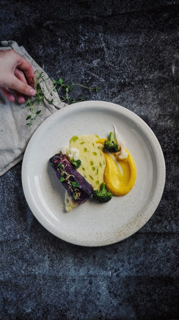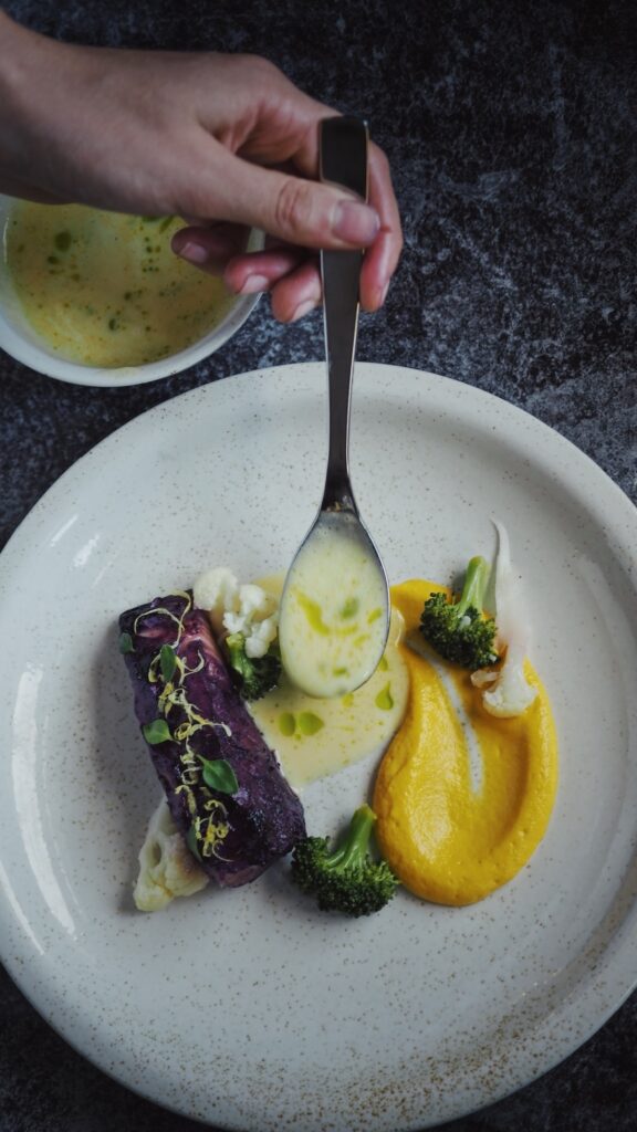 - Mausta kastike Sauterneshyytelöllä, baslamicoetikalla. Vatkaa vispilällä voi kuutioina joukkoon, kunnes kastikkeesta tulee kiiltävä. Mausta kastike lopuksi suolalla.