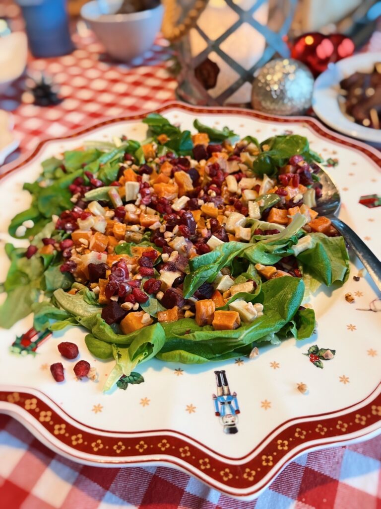 Jouluinen juuressalaatti manteleilla ja granaattiomenasiemenillä sopii erinomaisesti joulupöytään.