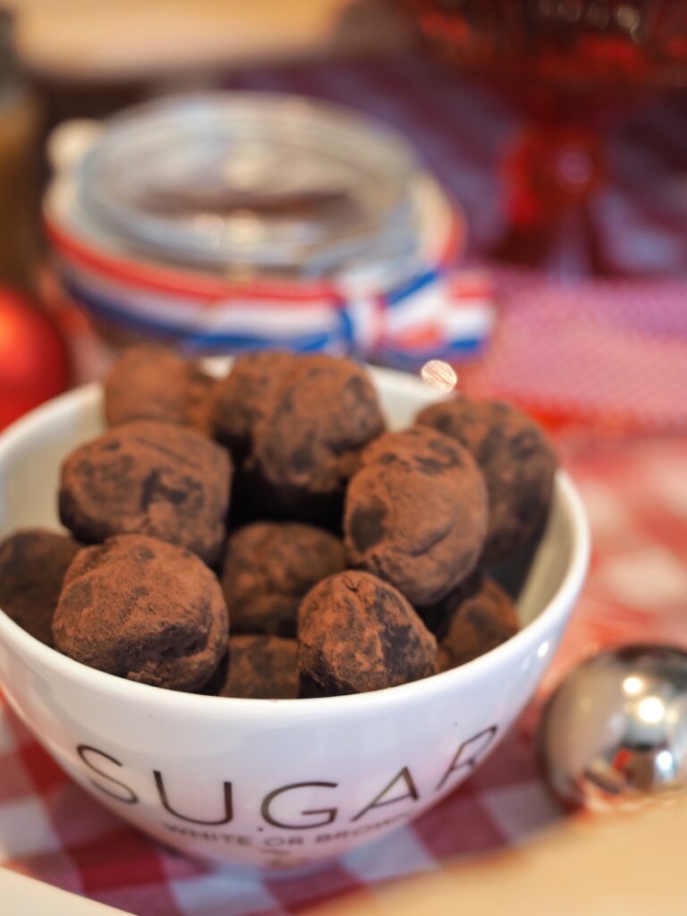 Ota lusikallinen tryffelimassaa ja pyöritä lämpimin käsin palloiksi. Tryffelit pyöräytetään vielä hienossa sokerissa tai kaakaojauheessa.