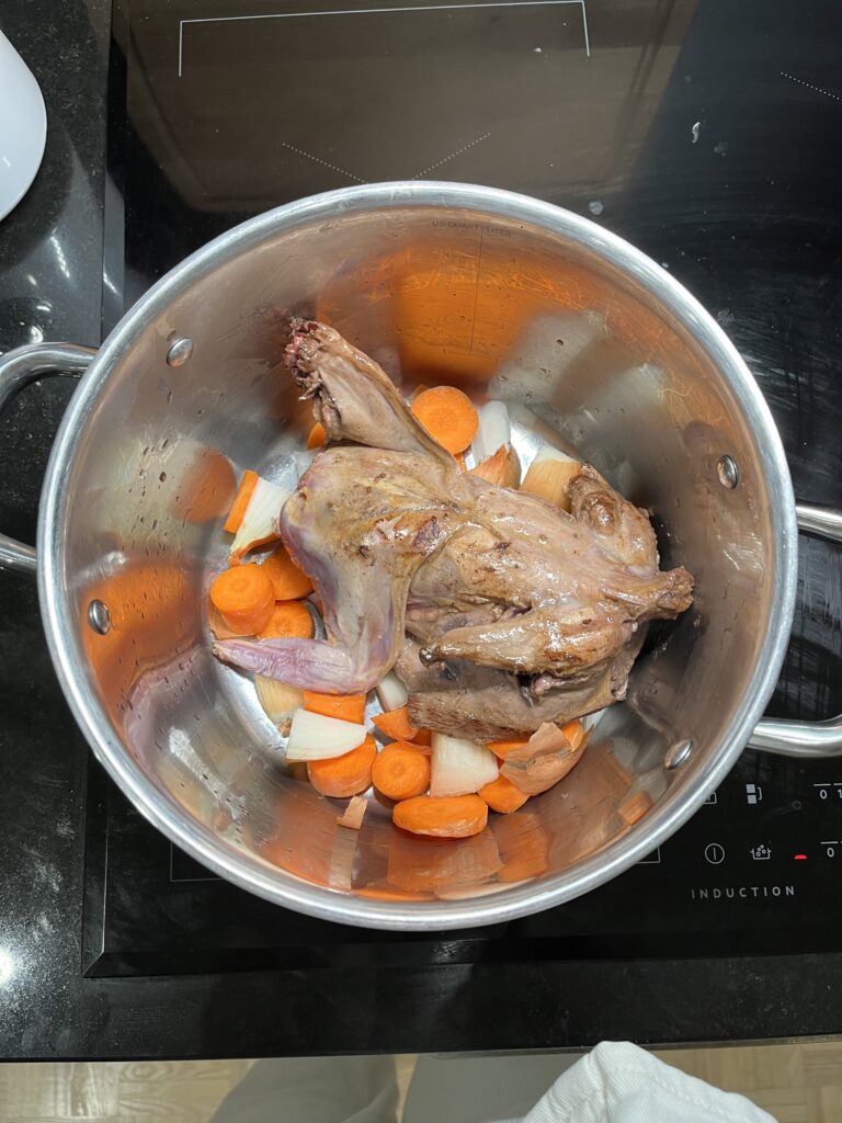 - Kuumenna pannu öljyn kanssa ja lisää kuumalle pannulle teeri, voi sekä mausteet. Ruskista pinnat (max minuutti per puoli.)