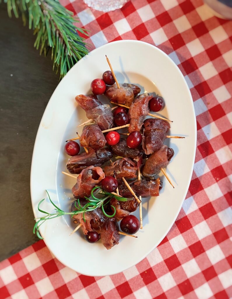 Nyt on täydellinen sormisyötävä pikkujouluihin tai joulun alkuruokapöytään. Makean ja suolaisen liitto: ilmakuivattuun kinkkuun käärityt taatelit.