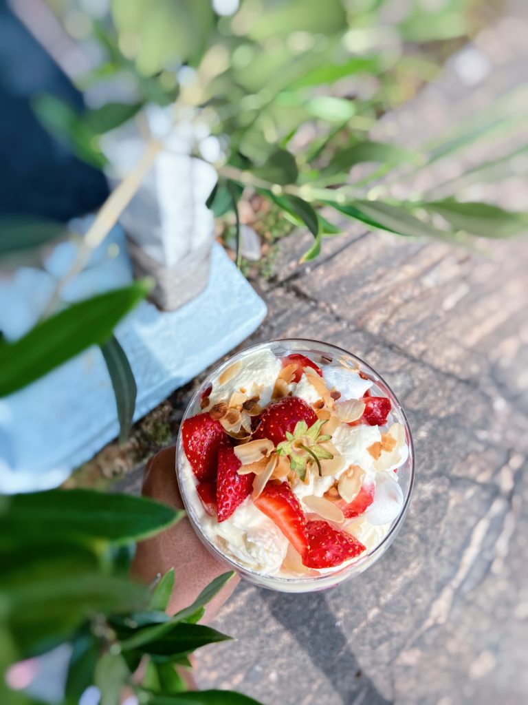 - Koristele Eton Mess pienillä mansikoilla ja paahdetuilla mantelilastuilla.