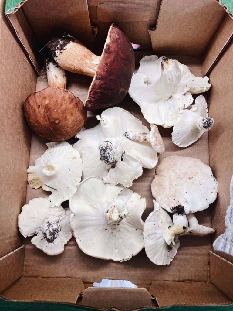 - 500 g sieniä (tatteja, lampaankääpä, mustatorvisieniä, herkkusieniä)