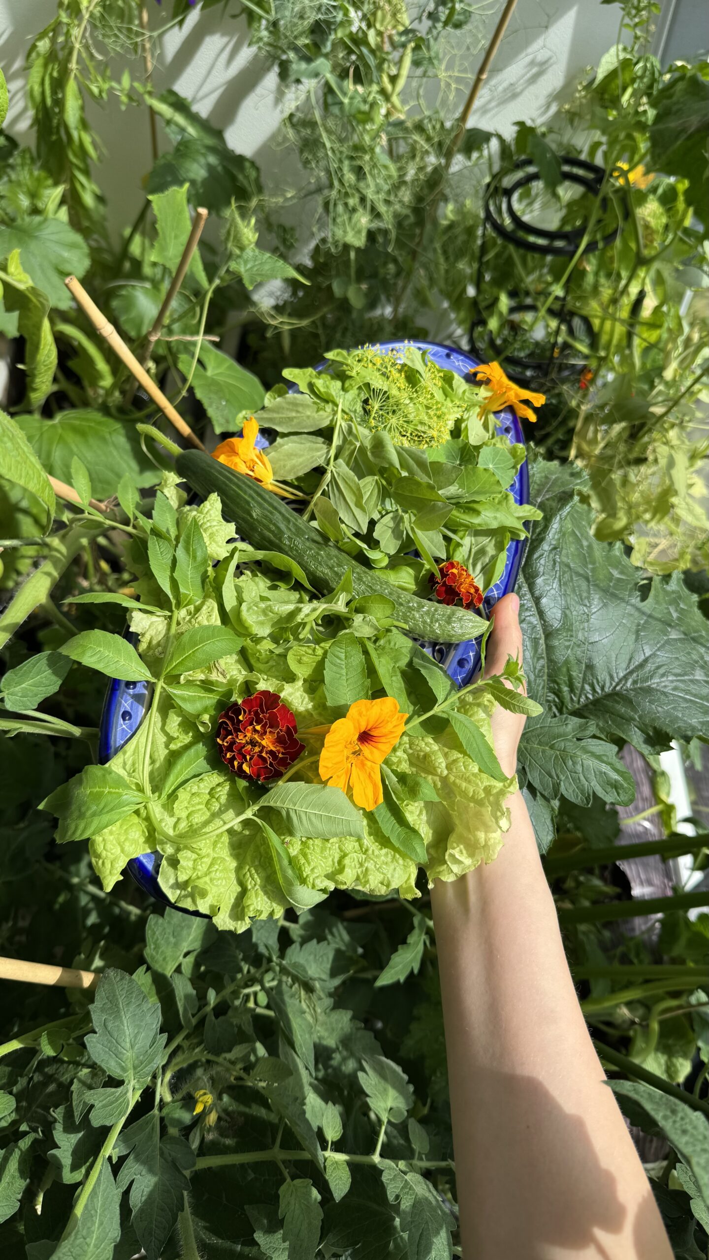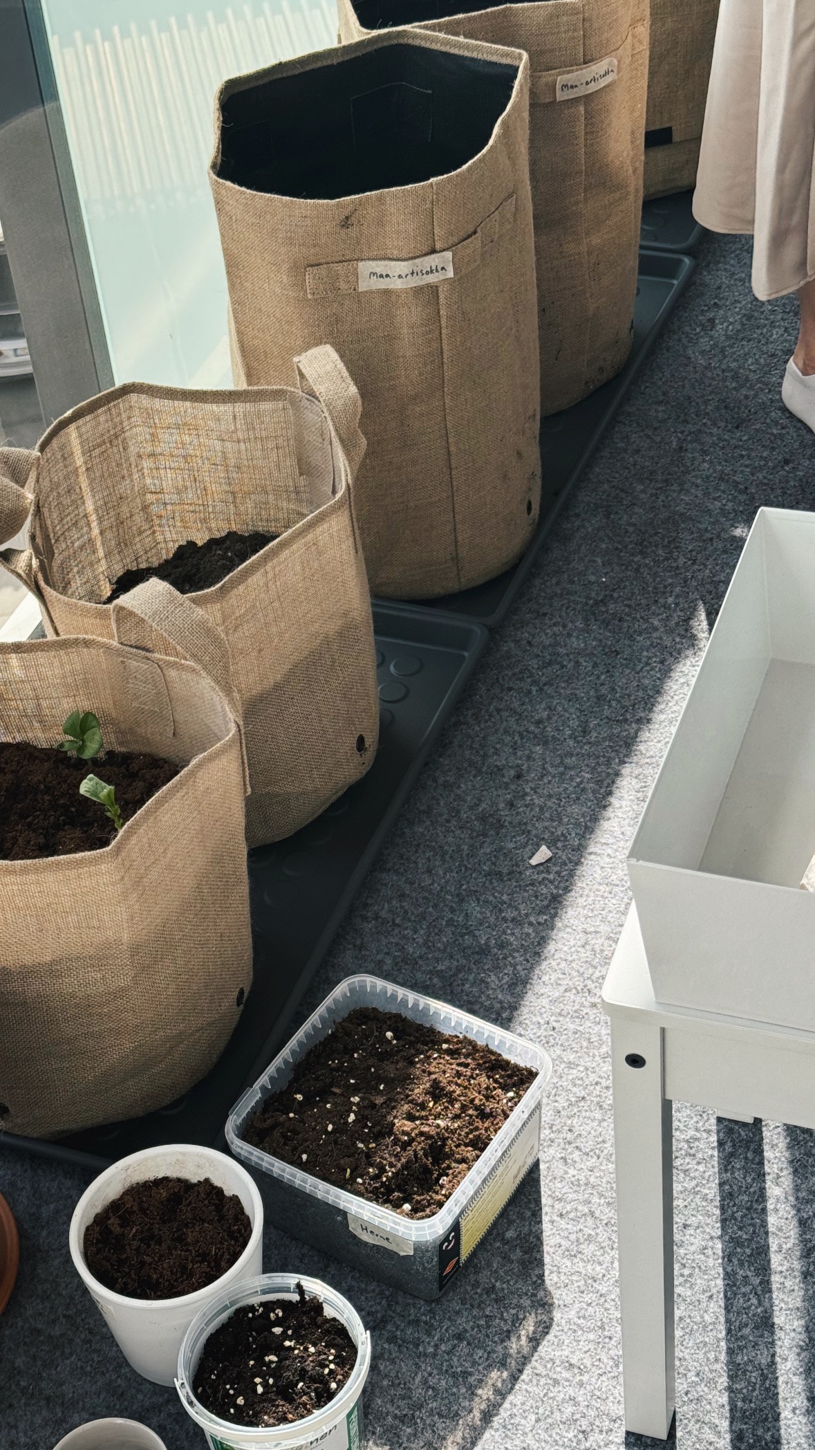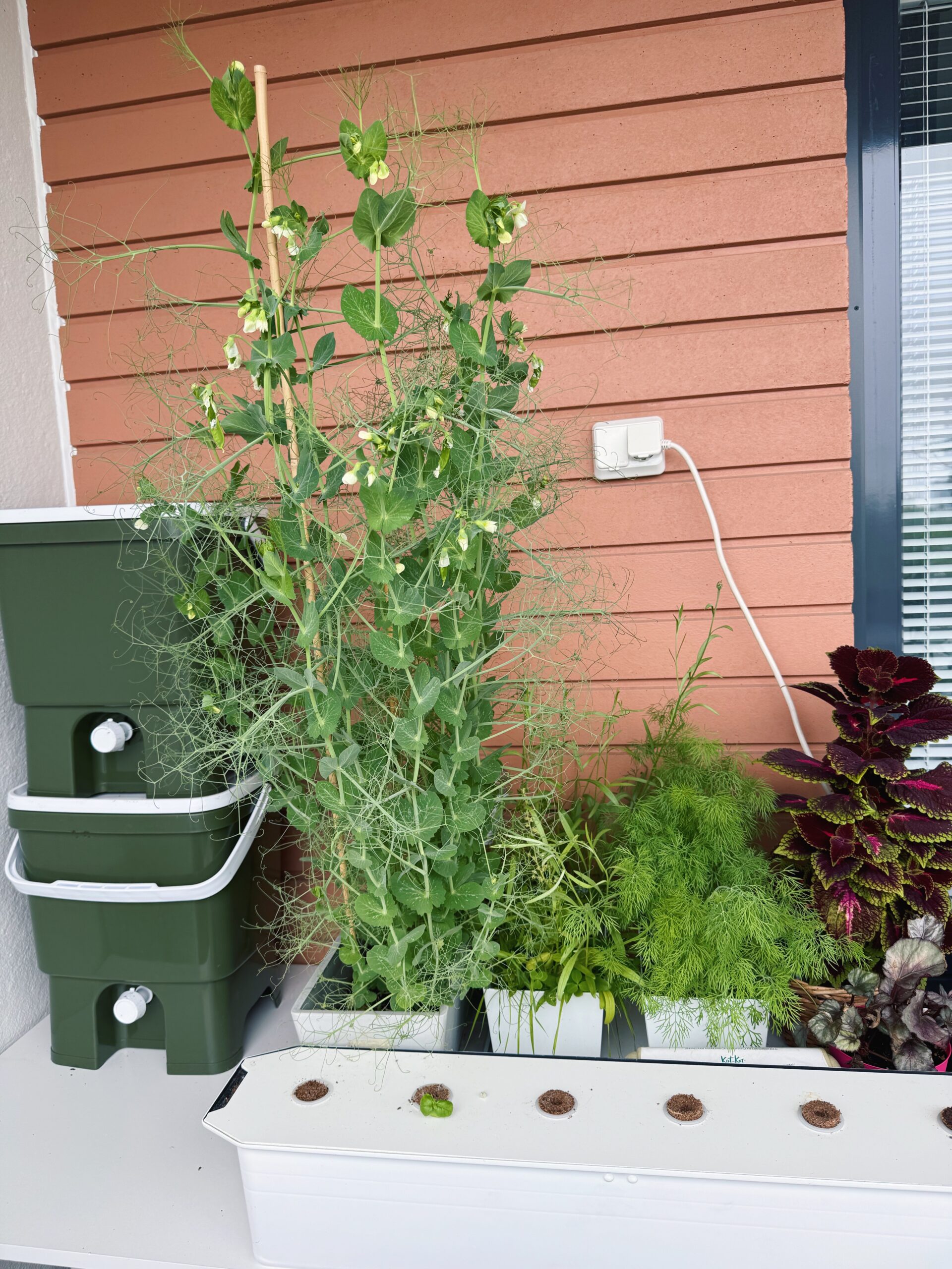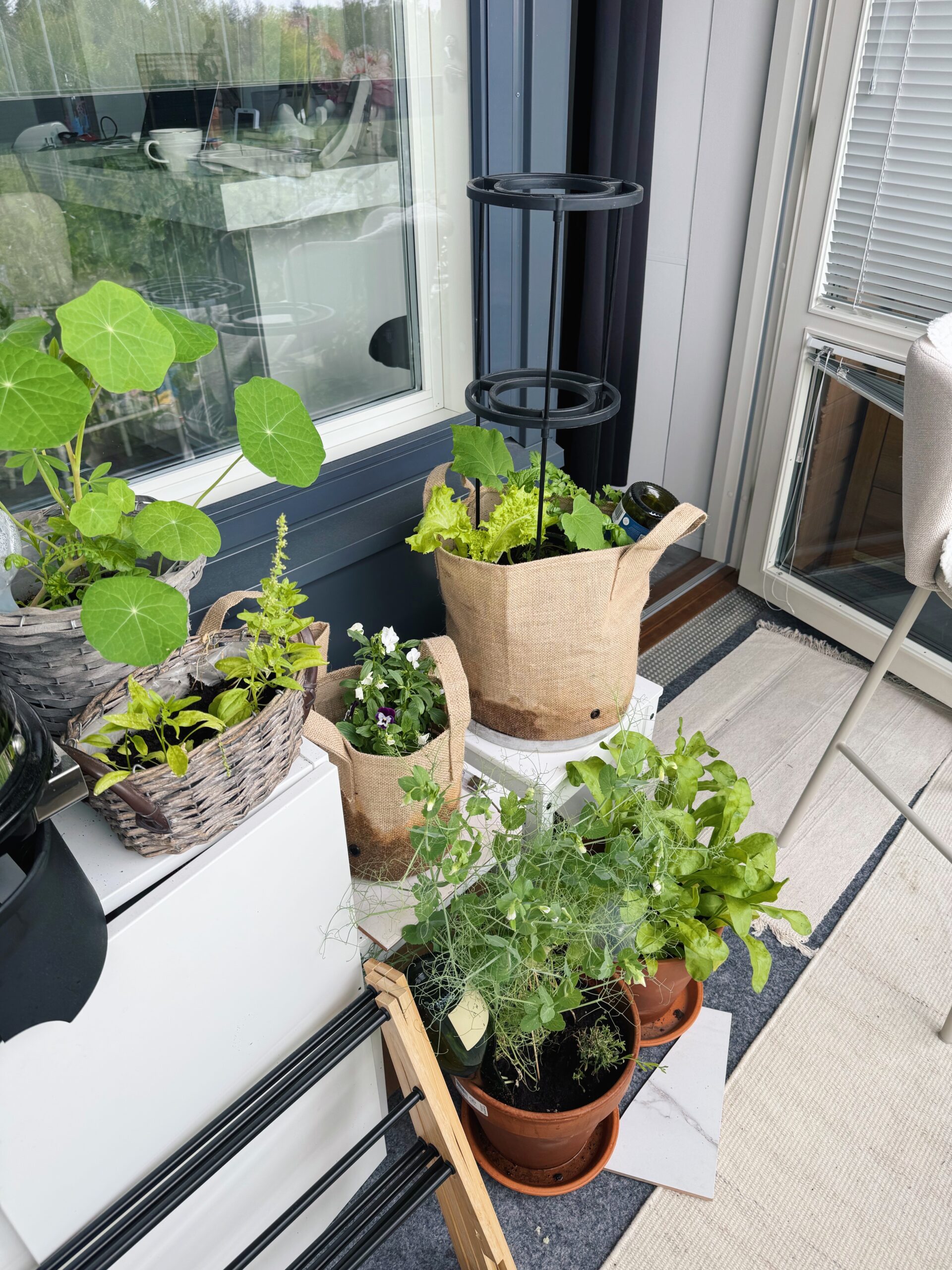 Minun parvekkeeni sijaitsee ylimmässä kerroksessa, ja aurinko paistaa sinne heti auringonnoususta noin kello 13 asti. Eli valoisaa riittää aamusta puoleenpäivään, mutta iltapäivisin parveke jää varjoisammaksi, täydellinen olosuhde monille yrteille, tomaateille ja palkokasveille. Kasvatin suurimman osan kasveista siemenistä, mutta tomaatin, kurkun, sitruunaverbenan ja kesäkurpitsan taimet ostin puutarhamyymälästä.