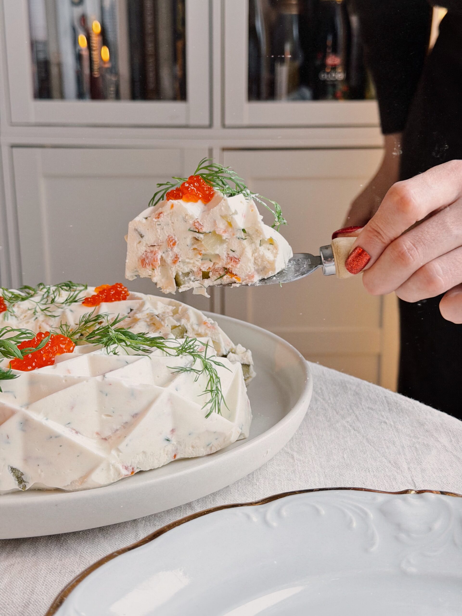 - Kumoa kylmäsavulohimoussekakku tarjoiluastialle upottamalla vuoka 10–15 sekunniksi lämpimään veteen.