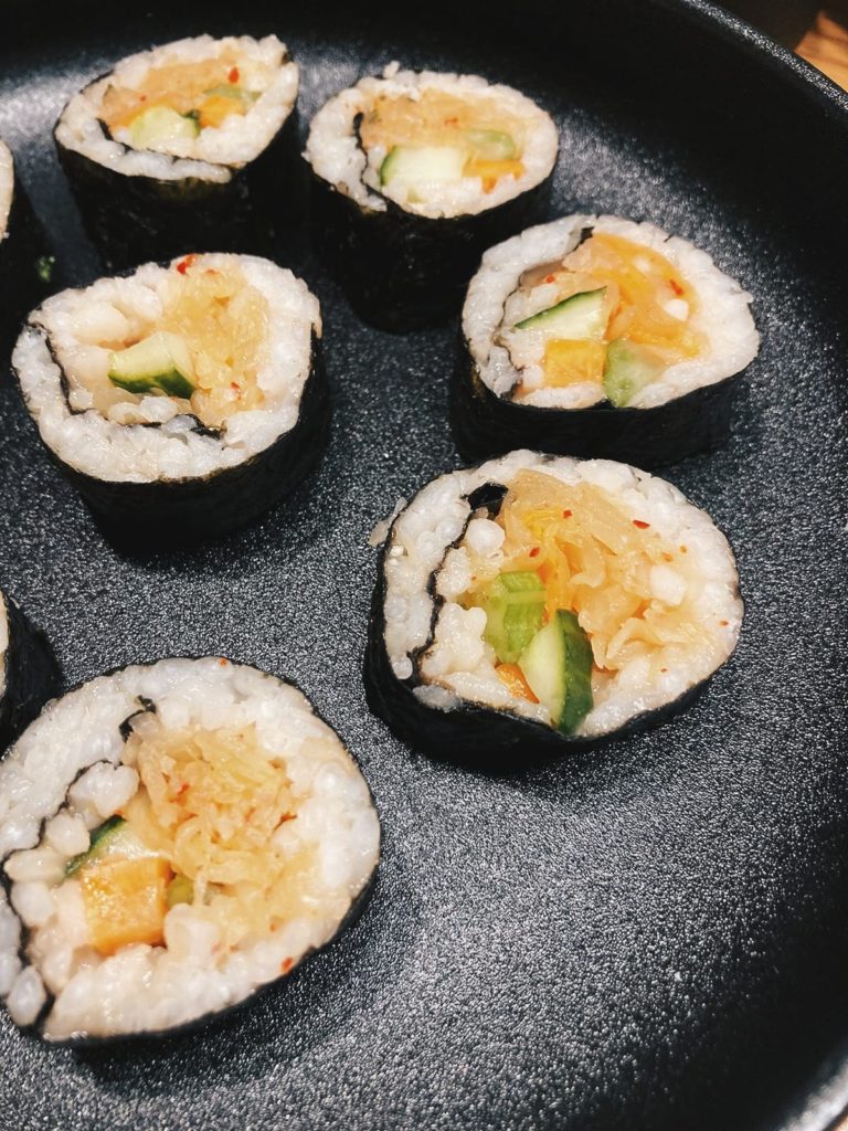 Kimbap on peritaatteessa korealaista sushia. Ei ole yhtä ja oikeaa tapaa tehdä kimbapia, joten mekin loimme oman versiomme tästä korealaisesta herkusta. Kimbap on tunnettu makupommi sisältäen yleensä naudanlihaa, jonkin sortin makkaraa tai munakasta. Täytteinä käytetään myös erilaisia kasviksia mm. kurkkua, porkkanaa ja aasialaista retikkaa sekä kimchiä. Teimme kimbapistamme täysin vegaanisen version raikkailla täytteillä. Täytteiksi valikoitui kurkku ja porkkana sekä chilillä ja inkiväärillä maustettu hapankaali eli Hapiskimchi. Kimpabin kaveriksi sopii hyvin umaminen ja tuhti dippi. Voimme luvata, että makunystyräsi pomppivat ilosta tämän suupalan jälkeen.