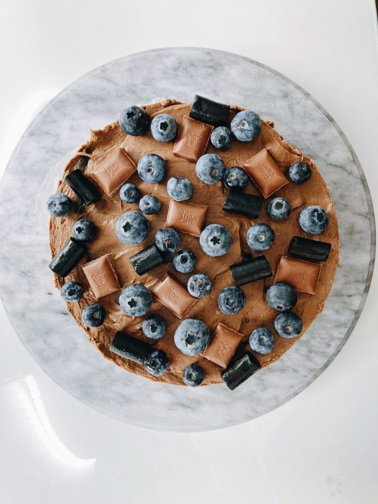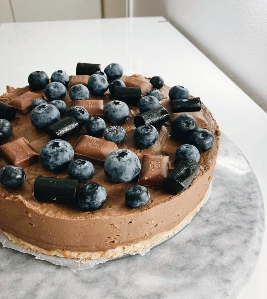 - Kaada täyte vuokaan ja anna jähmettyä vähintään 3 tuntia tai mielellään yön yli. Koristele kakku suklaapaloilla, lakuilla ja pensasmustikoilla