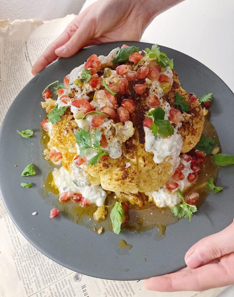 - Koristele kukkakaali turkkilaisella jogurtilla, granaatinomenan siemenillä, pistaasipähkinöillä ja korianterilla. Nauti <3