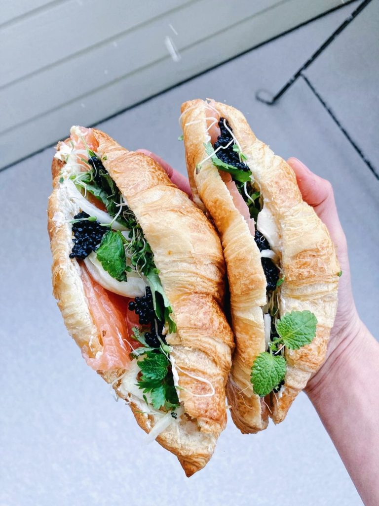 - Sivele croissantteihin piparjuurituorejuustoa ja täytä croissantit lohella, fenkolilla, yrteillä ja merileväkaviaarilla.