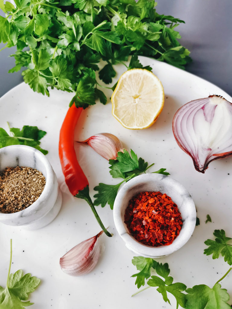 - Lisää tehosekoittimen tai blenderiin lehtipersilja, oregano, korianteri, sipuli, chili ja valkosipuli ja sekoita tasaiseksi. Lisää oliiviöljy, etikka ja sitruunamehu . Mausta suolalla ja lisää maun mukaan.