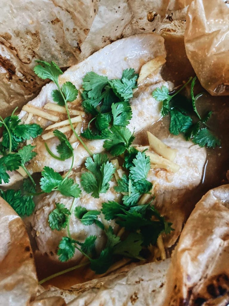 - Paista leivinpaperikääröä uunissa 200-asteessa 15-20 minuuttia. Koristele kala korianterilla ja tarjoile keitetyn riisin kanssa. Nauti <3