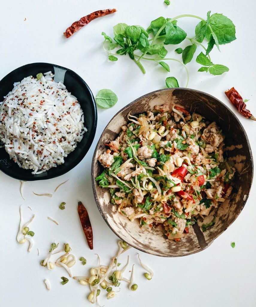 Tulisen hapan kombo täynnä raikkaita yrttejä, irtuja, chiliä ja herkullista kananjauhelihaa. Melkein meinasin nimetä reseptin kanalarbiksi, mutta kokonaisuudesta puuttuu mm. jauhettu riisi. Terveellinen kanasalaatti sopii niin lounaaksi, kuin illalliseksi ja voit nauttia annoksen kylmänä tai lämpimänä. Resepti sopii myös todella hyvin mukaan otettavaksi evääksi esimerkiksi matkalle tai työpaikalle. Makunsa kanasalaatti saa Thaimaan keittiöstä.