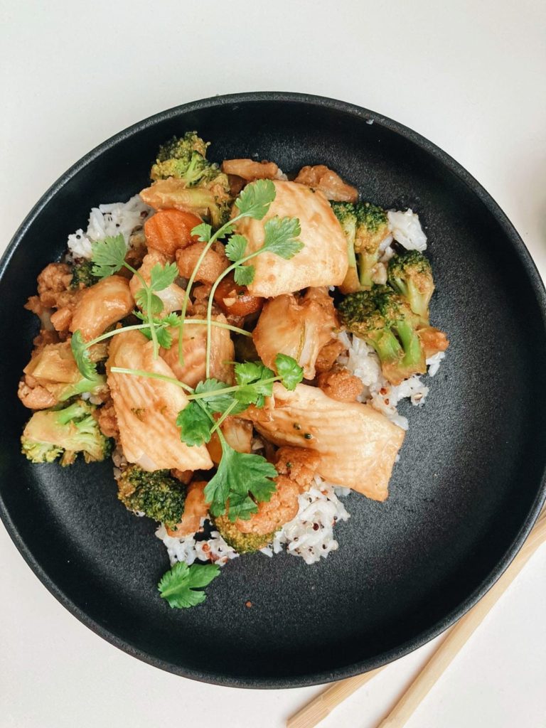 - Kuumenna paistin pannu ja ruskista kasviksia ja kalapaloja pannulla pari minuuttia. Lisää joukkoon kastike ja keitä kastiketta kokoon noin 5 minuuttia. Tarjoile wokki keitetyn riisin ja chiliöljyn kanssa. Nauti <3