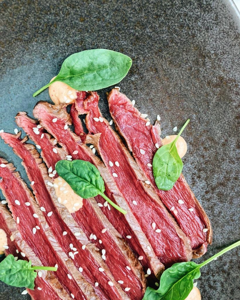 - Ota liha pois marinadista ja huoneenlämpöön. Leikkaa liha ohuiksi viipaleiksi terävällä veitsellä. Tarjoile ponzu-kastikkeen kera. Voit myös halutessasi lisätä annokseen sriracha-majoneesia *kuvassa