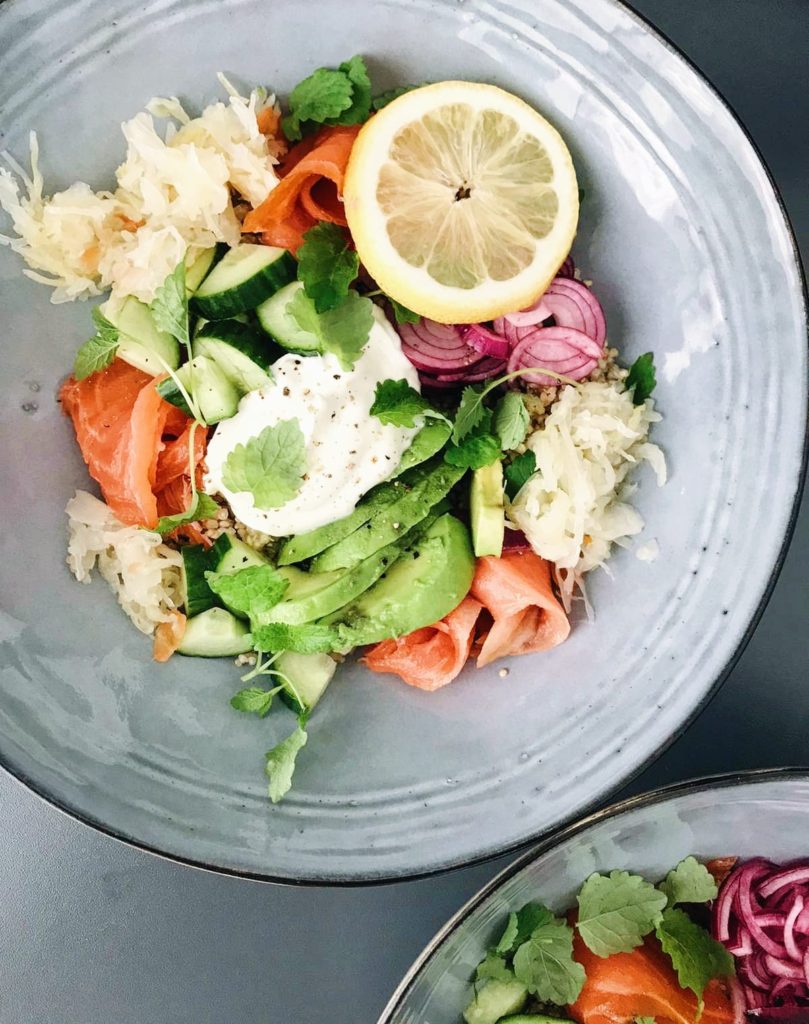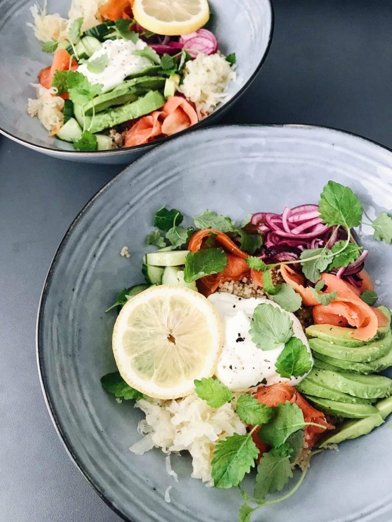 - Kokoa salaatti; Laita pohjalle kvinoa, purista päälle hieman stiruunamehua ja lisää loraus oliiviöljyä. Kokoa päälle punasipulin siivut, kurkut, avokado, kylmäsavulohi, kreikkalainen jogurtti ja Rasilaisen purjohapankaali.