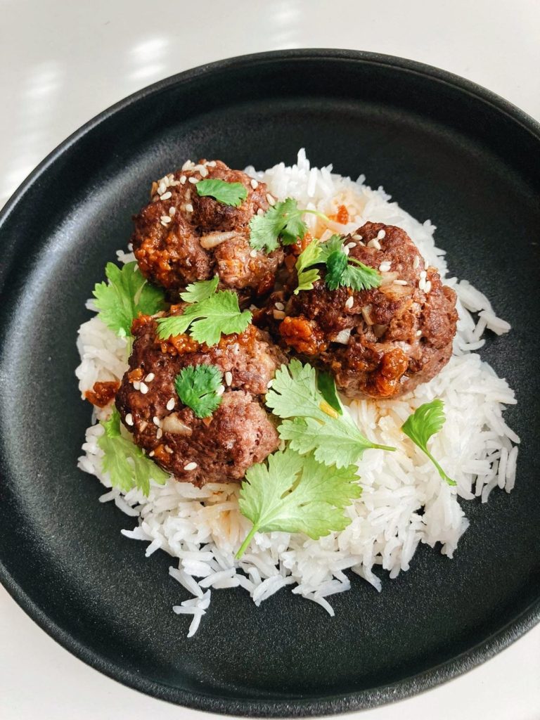 Kun me teemme jauhelihapihvejä tai -pullia emme käytä yleensä mitään sidostaineita, vaan nautimme lihan puhtaasta mausta. Liha pysyy hyvin koossa, kunhan ei ylikypsennä sitä. Meillä oli taas hirveä aasialaisen ruoan himo, kuten aina. Onneksi meillä oli jääkaapissa jauhelihaa ja korealaisia aineksia, joten resepti syntyi kuin itsestään. Jos haluat omiin lihapulliisi pientä twistiä, tässä on maukas resepti joka lennättää sinut suoraan Koreaan. Emme pakanneet jauhelihapullia ihan täyteen korealaista makua, vaan meistä on kiva, että se lihan maku on pääosassa. Tarjoile korealaiset jauhelihapullat keitetyn riisin, superhelpon kastikkeen ja raikkaiden kurkkutikkujen kanssa. Helppoa, nopeaa ja maukasta arkiruokaa <3