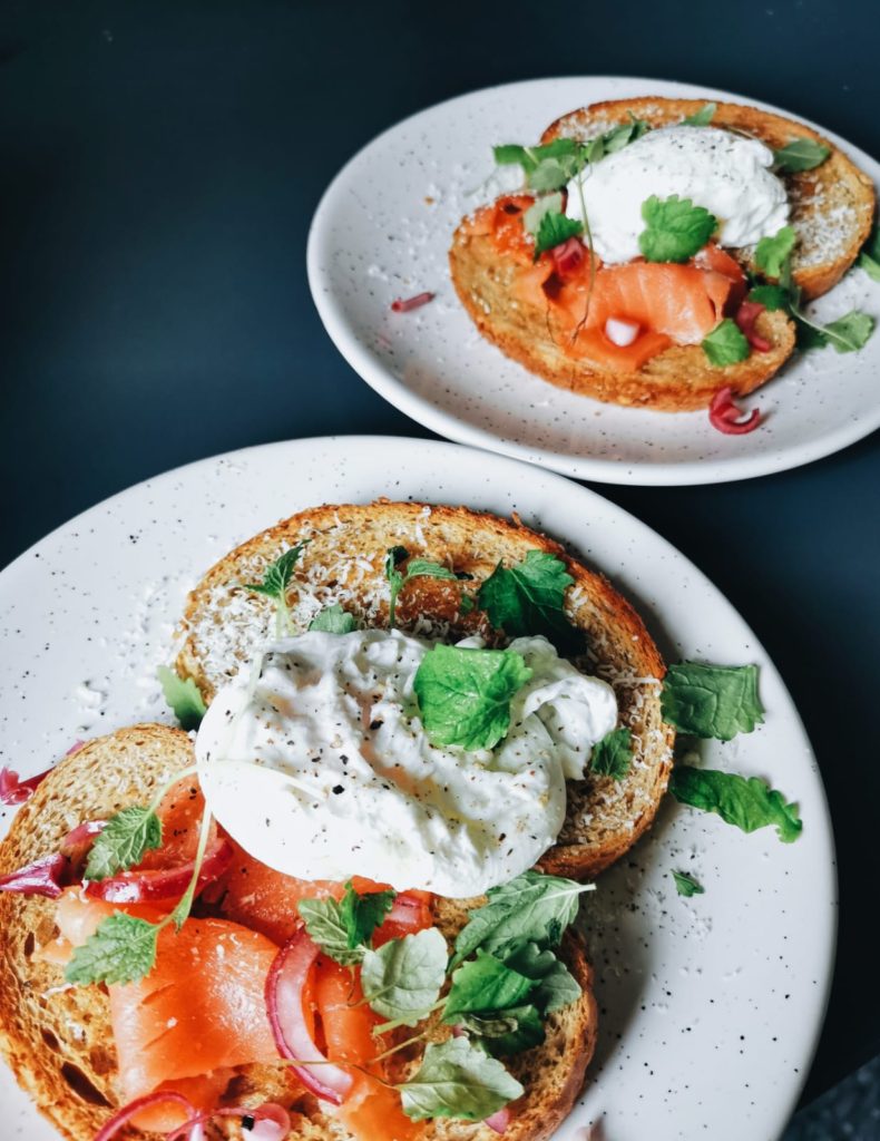 Rapeaksi paahdetut leivät kylmäsavulohella ja uppomunalla sopivat esimerkiksi brunssille tai muuten vaan hitaisiin aamuihin.