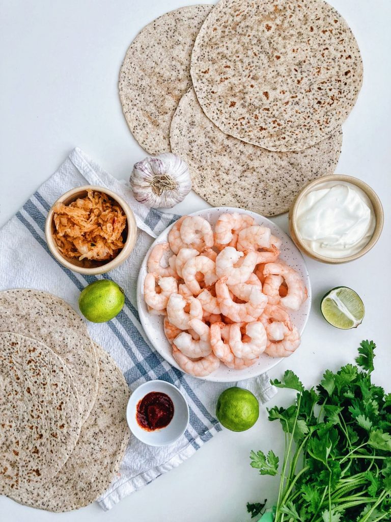 Fuusioruokaa parhaimmillaan. Kimchi katkarapu tortillat saavat korealaisen vivahteen Rasilaisen Hapiskimchistä ja korealaisella chilitahnalla maustetuista katkaravuista. Helpot tortillat sopivat esimerkiksi mukaan otettaviksi eväiksi tai lounaaksi.