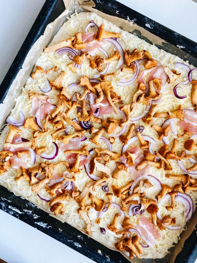- Painele pizzapohja pellille öljytylle leivinpaperille ohueksi. Lisää pohjalle juokseva koskenlaskija sekä mozzarellaraaste. Laita kantarellit, punasipulit ja pekonipalat pizzan päälle.