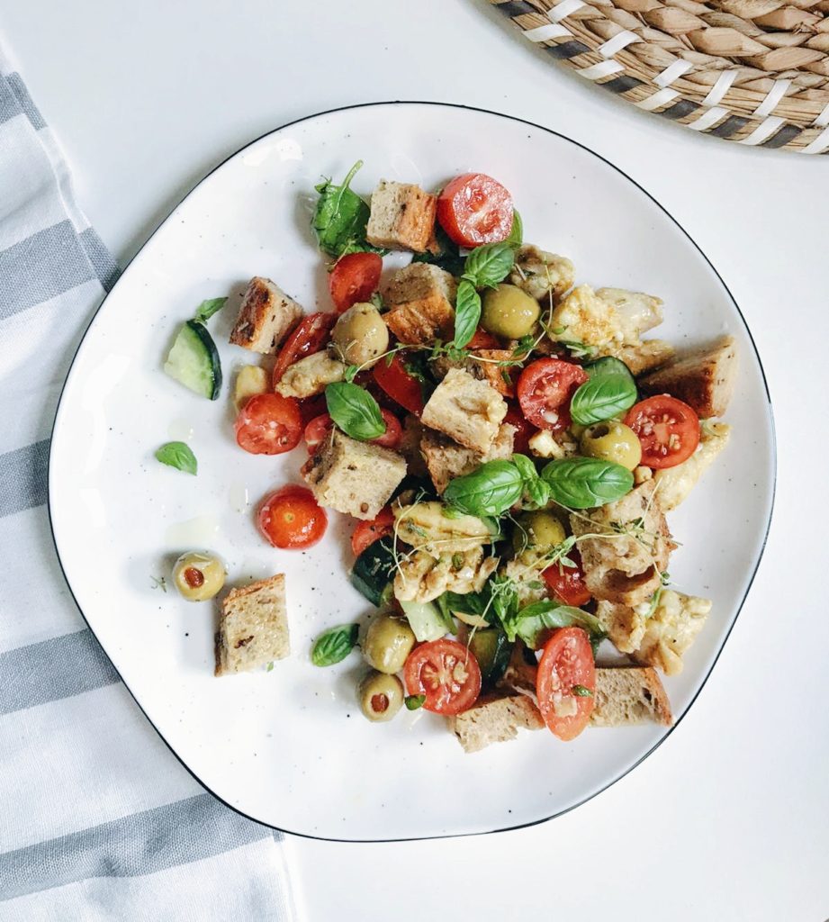 Tämä välimeren leipä-tomaattisalaatti on raikas, mutta silti tarpeeksi runsas syötäväksi kevyeksi illalliseksi tai lounaaksi.