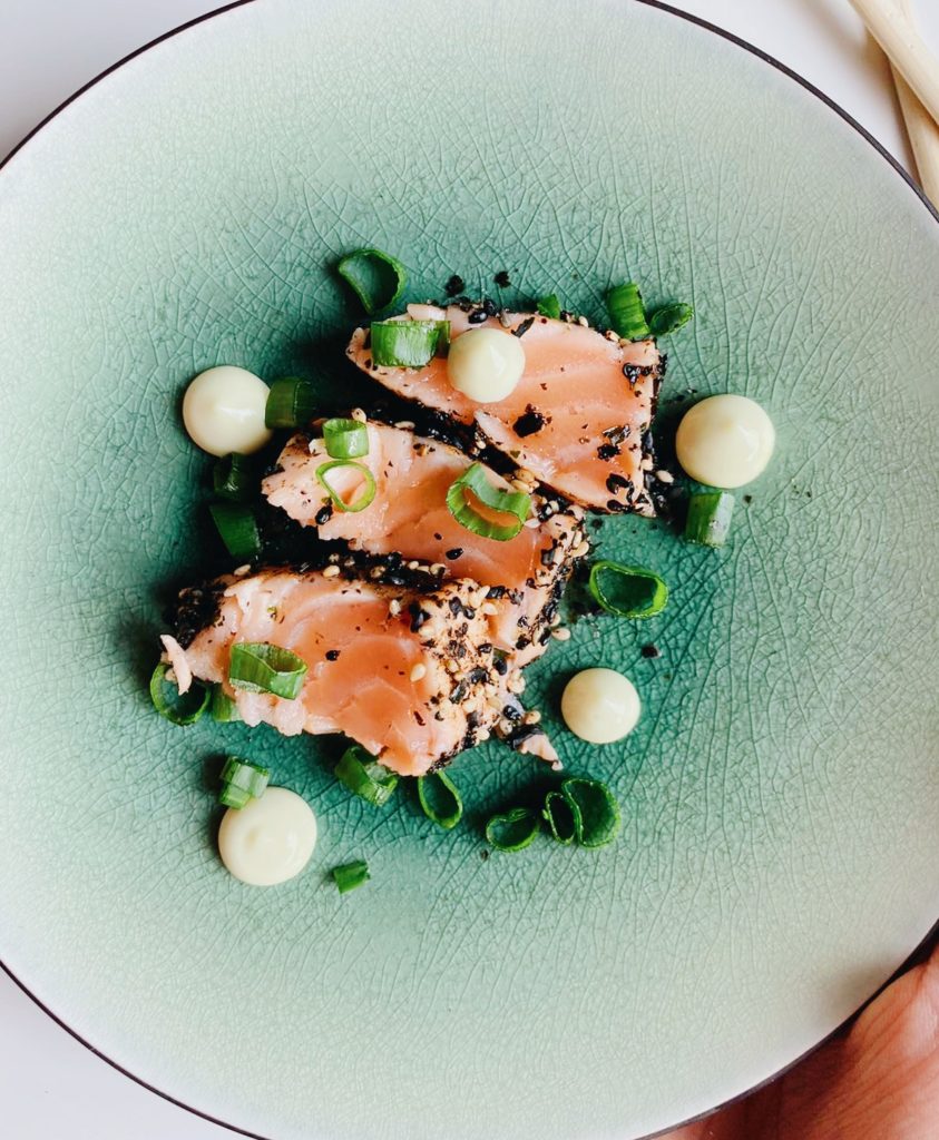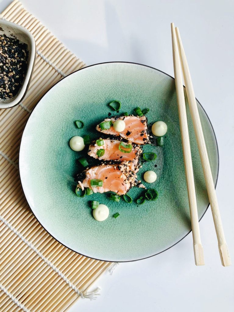 Japanilainen lohitataki inkivääriglaseerauksella ja furikakella