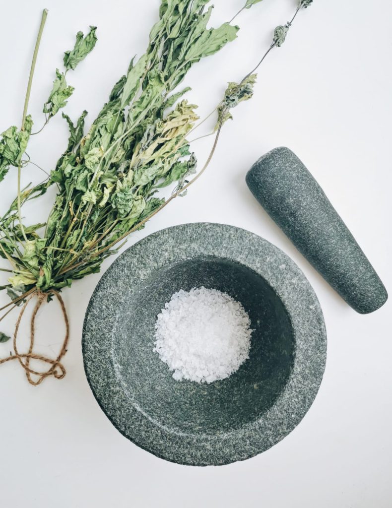 Erottele lipstikan lehdet varsista ja hienonna niitä hieman. Laita lipstikat ja suola mortteliin. Sekoita karkeaksi seokseksi.