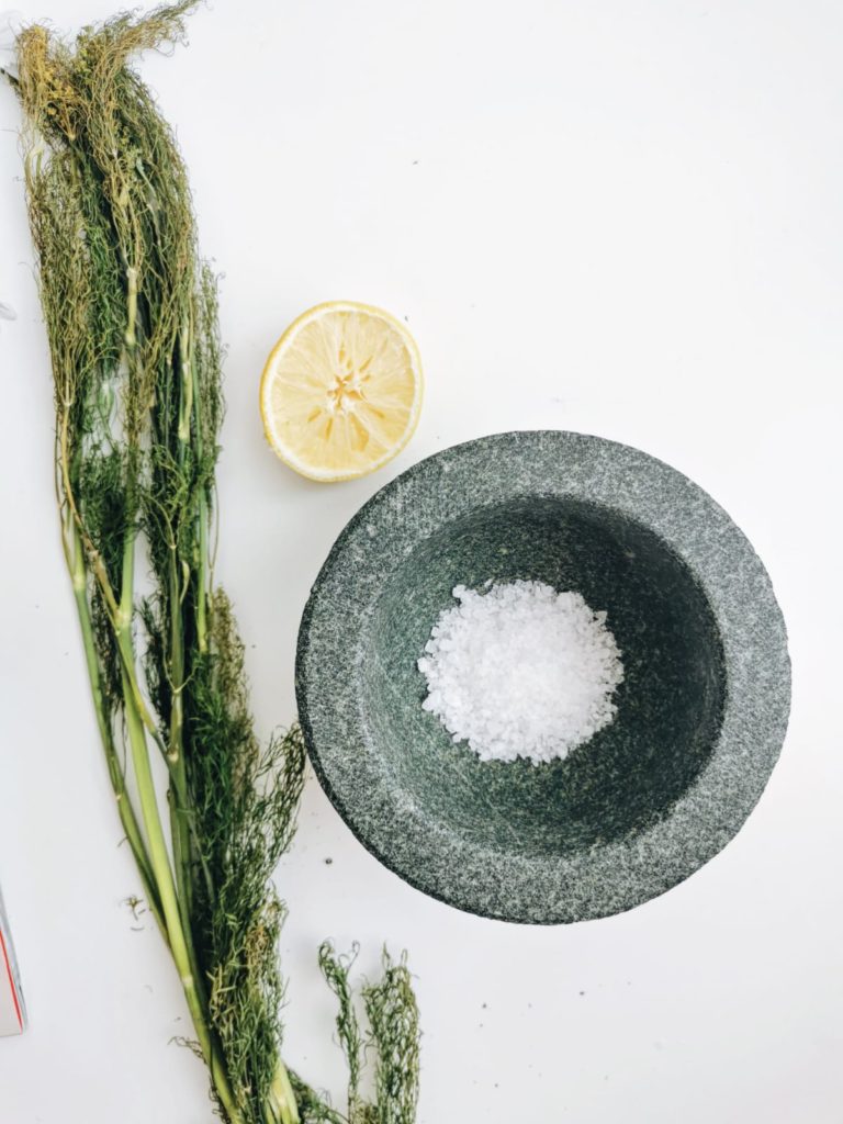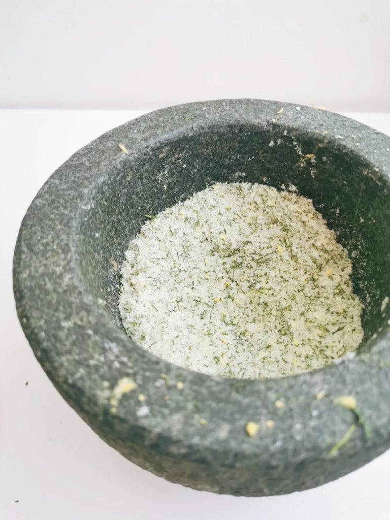 - Hienonna kuivattu tilli ja merisuola morttelissa. Sekoita joukkoon raastettu sitruunan mehu.