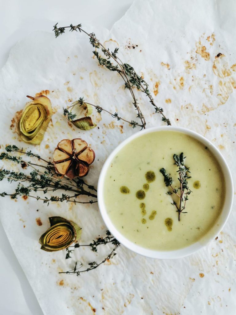 - Lisää lopuksi valkosipulit, purjo, kerma ja sekoita keitto sileäksi. Lisää nestettä tarvittaessa. Mausta voilla, timjamilla, suolalla ja pippurilla.
