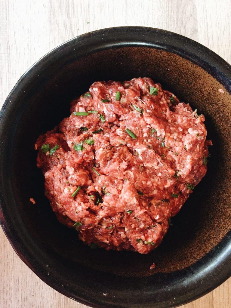 - Kuori ja hienonna valkosipulit. Hienonna kevätsipulin varsi. Sekoita pihvien ainekset keskenään tasaiseksi massaksi. Varmista että mausteet ovat kunnolla sekoittuneet. Muotoile massasta 4 suurehkoa pihviä.