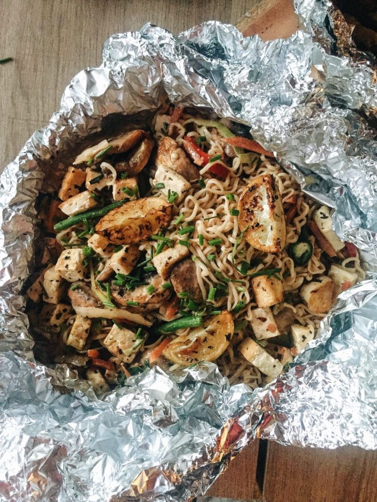 - Tee kaksi nyyttiä: Lisää kolmen foliosiivun päälle nuudelit, kasvikset, kanat/tofut ja lisää kookoskerma niin että lisäät puolet toiseen nyyttiin ja puolet toiseen.