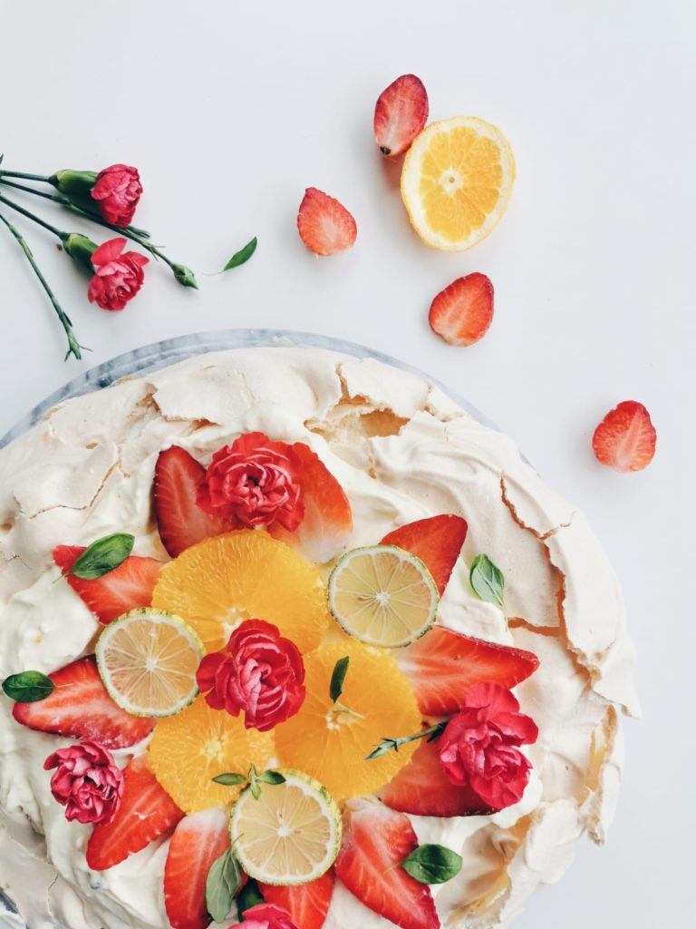 Täytä ja koristele pavlova esimerkiksi sitrushedelmillä, passionhedelmillä ja marjoilla.