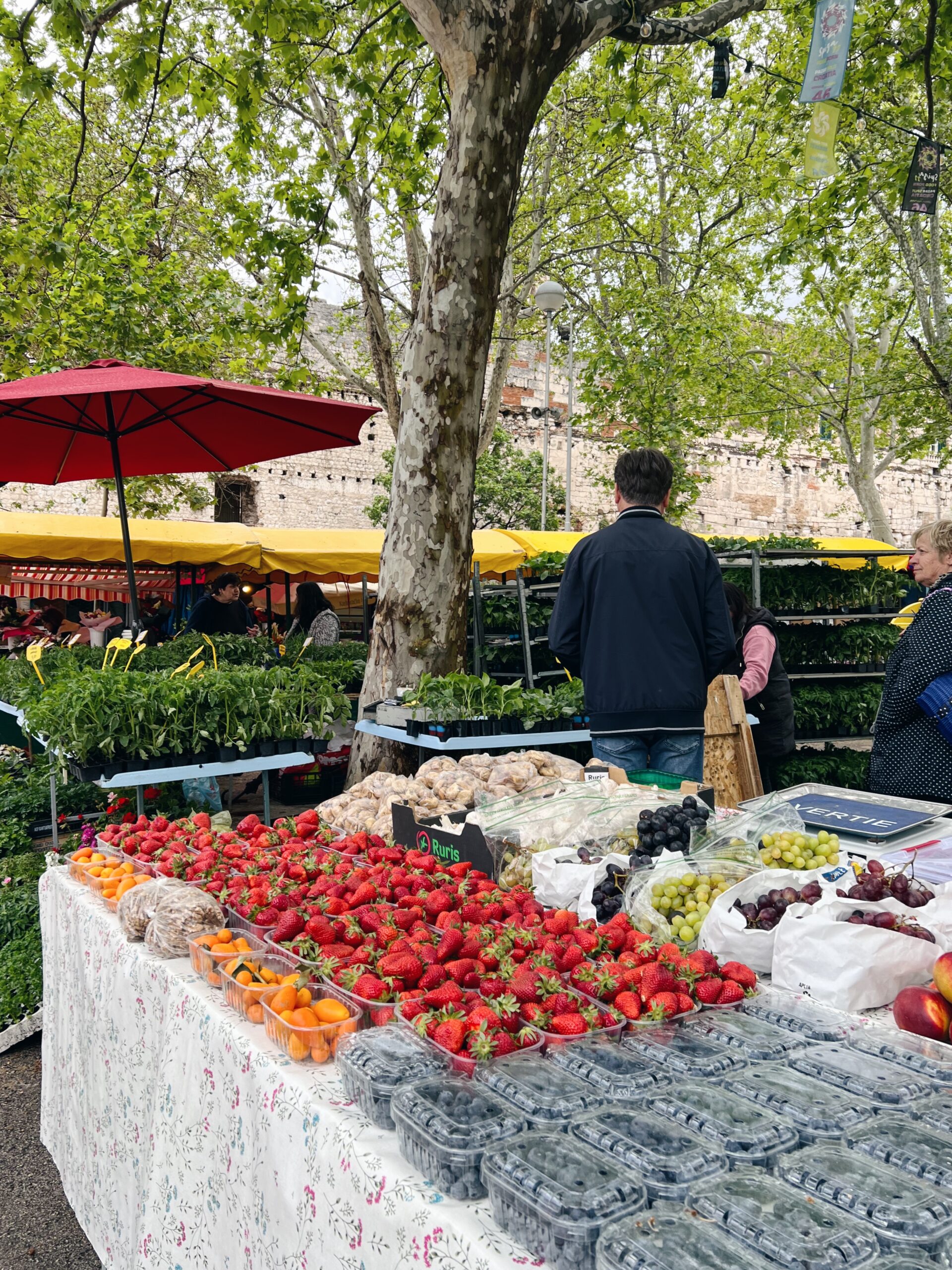 Splitin keskustan kupeessa majailee paikallinen ruokamarkkina, josta voi ostaa lähellä kasvatettuja sesonkivihanneksia, juustoa, voita ja leikkeleitä. Markettia ympäröi myös muutama lihakauppa ja leipomo. Vierailimme loman alkupuolella marketissa shoppailen raaka-aineet tulevalle viikolla. Marketti sijaitsee aivan Diocletianuksen palatsin vieressä ja sen ympäristössä kannattaa pysähtyä myös kahviloihin ja leipomoihin sillä muun muassa cappucinon sai eurolla.