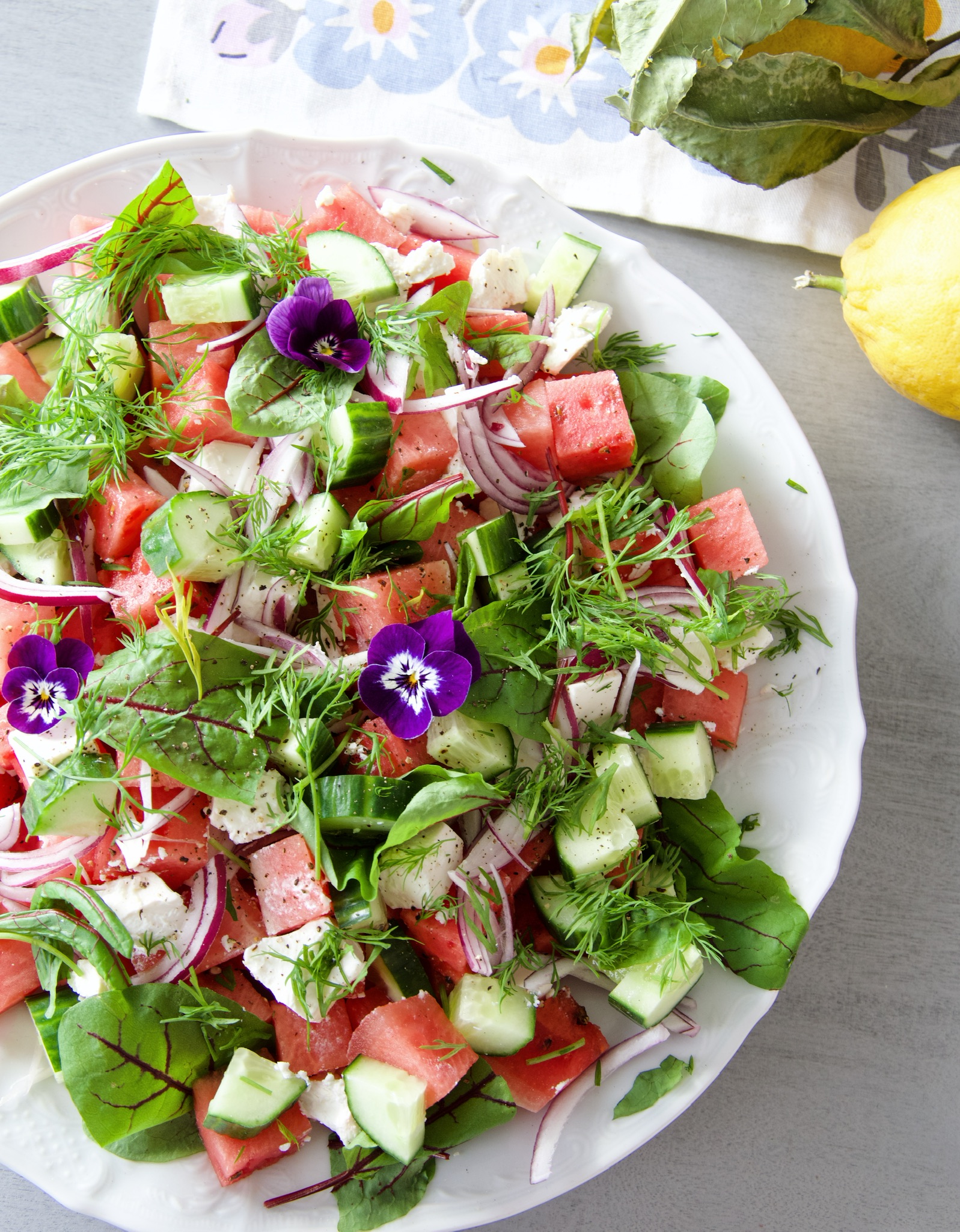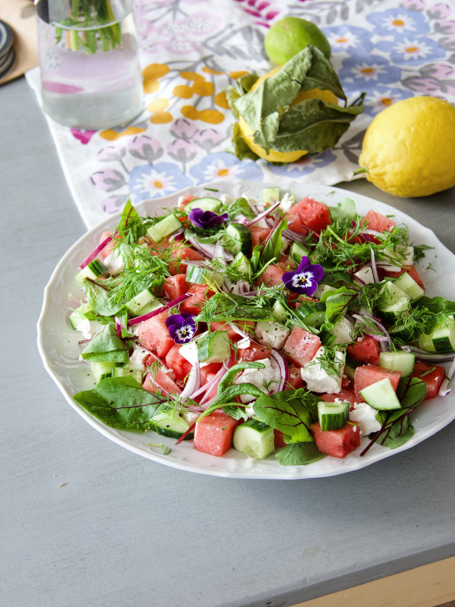 Raikas vesimeloni saa kaverikseen kreikkalaisen salaatin tuttuja kasviksia kuten kurkkua ja punasipulia. Kreikkalainen feta-melonisalaatti on raikas lisuke kesän grillailuun tai brunssille. Viimeistele salaatti tuoreilla yrteillä, kreikkalaisella oliiviöljyllä ja tietysti fetalla.