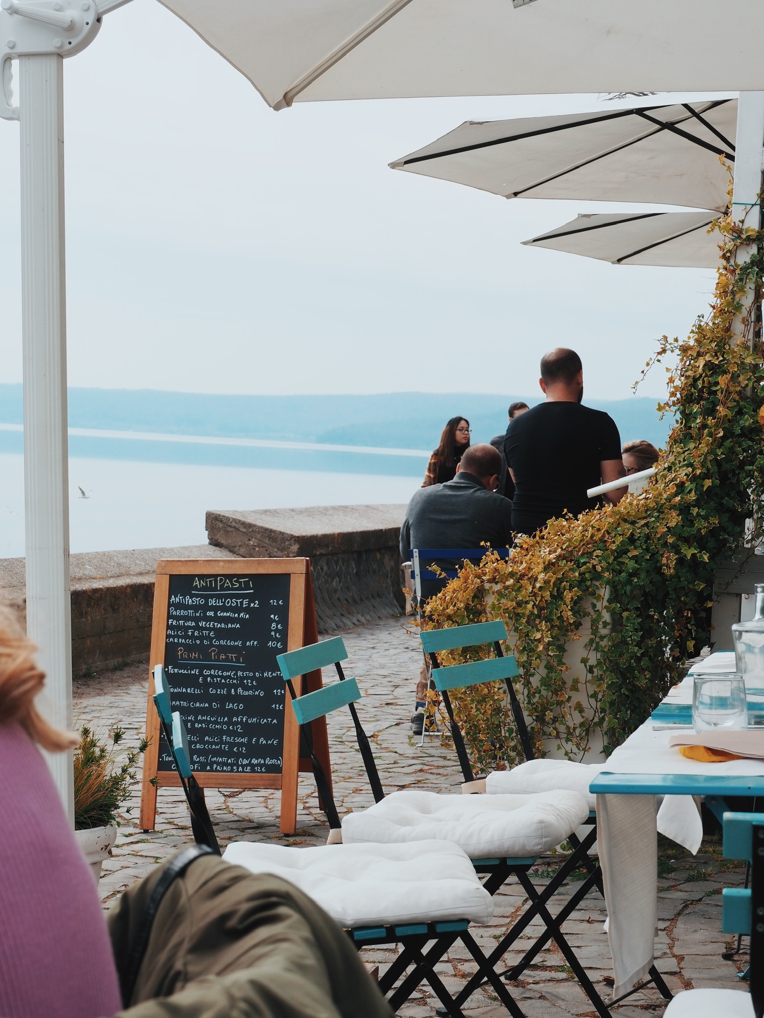 Trevignano Romanon rantaviiva on täynnä kauniita ravintoloita. Monet ravintolat ovat paikallisia perheravintoloita joissa hyödynnettiin sesongin tarjontaa. Viikonloppuna ravintolat olivat täynnä paikallisia. Maanantaina koko kylä hiljeni. Sää maaliskuussa oli päivällä +15-19-asteen paikkeilla. Aurinko lämmitti etenkin keskipäivällä ja lounasta sai nauttia aurinkoisessa säässä ihan topissa.